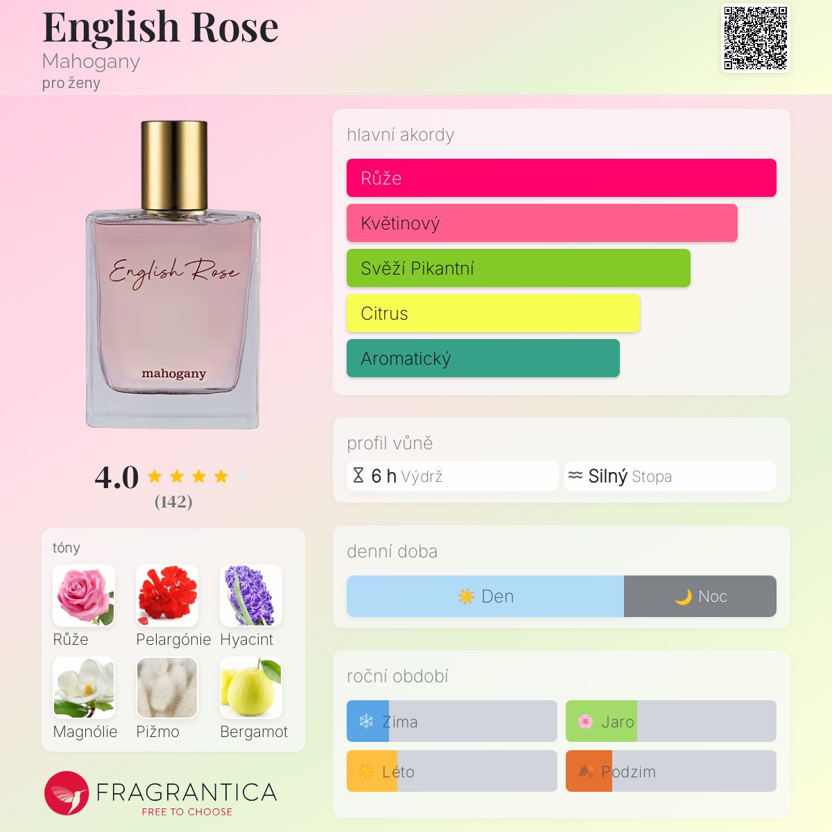 English Rose podle Mahogany je Floral vůně pro ženy. English Rose byl/a uveden/a v roce 2009. Vrchní tóny jsou Růže, Hyacint, Bergamot a Sicilský citron; střední tóny jsouRůžová růže, Pelargónie, Magnólie a Broskev ; základní tóny jsou Pižmo, Santalové dřevo a Jantar (ambra).