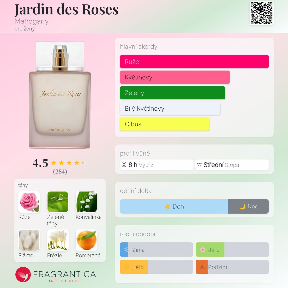 Jardin des Roses podle Mahogany je Floral Woody Musk vůně pro ženy. Vrchní tóny jsou Zelené tóny, Pomeranč, Mandarinka a Černý rybíz; střední tóny jsouRůže, Konvalinka, Frézie, Jasmín a Žluté ovoce ; základní tóny jsou Pižmo, Cedr, Santalové dřevo a Jantar (ambra).