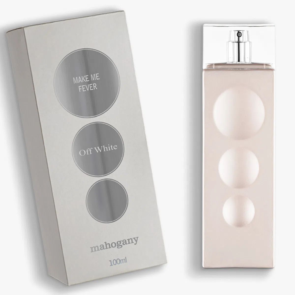 Make Me Fever Off White podle Mahogany je Orientální Floral vůně pro ženy. Make Me Fever Off White byl/a uveden/a v roce 2022. Vrchní tóny jsou Hruška, Sicilský citron, Pomerančovník hořký, Petitgrain a Růžový pepř; střední tóny jsouJasmín Sambac, Růže, Pomerančový květ, Broskev, Kosatec, Konvalinka a Ylang-Ylang ; základní tóny jsou Vanilka, Pižmo, Jantar (ambra), Virginský cedr, Santalové dřevo, Haitský vetiver a Mech.