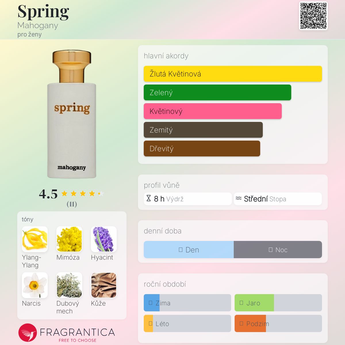 Spring podle Mahogany je Orientální Floral vůně pro ženy. Spring byl/a uveden/a v roce 2014. "Nosem" za touto vůní je Roland Theil. Vrchní tóny jsou Ylang-Ylang, Hyacint a Mandarinka; střední tóny jsouMimóza, Narcis, Jasmín, Růže a Galbanum ; základní tóny jsou Dubový mech, Kůže, Vetiver, Jantar (ambra), Vanilka a Pižmo.