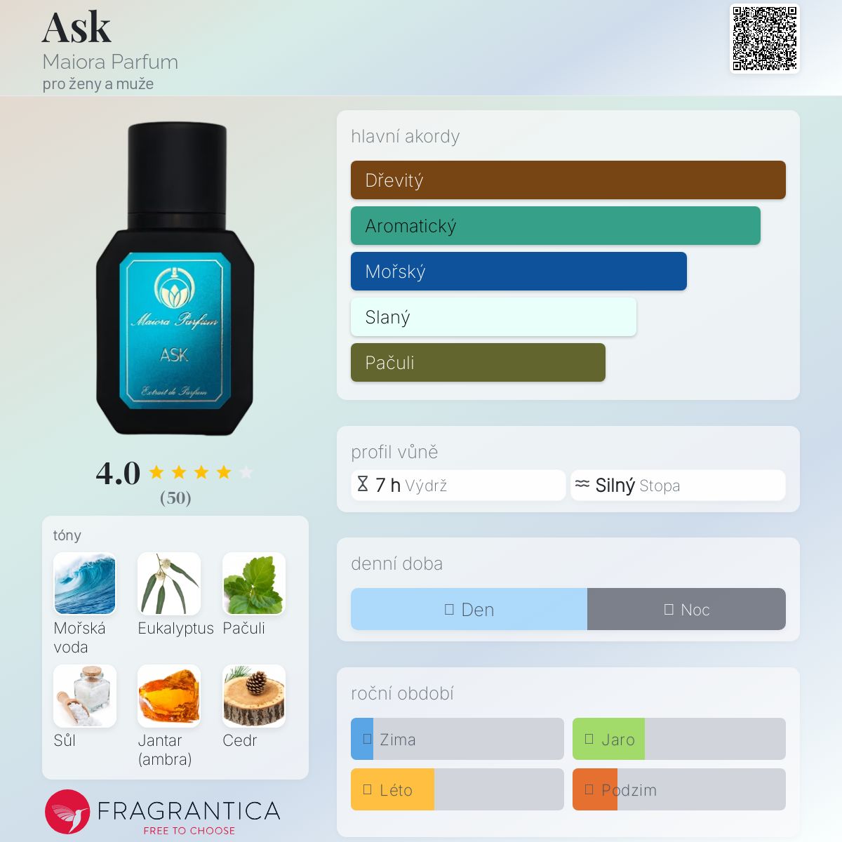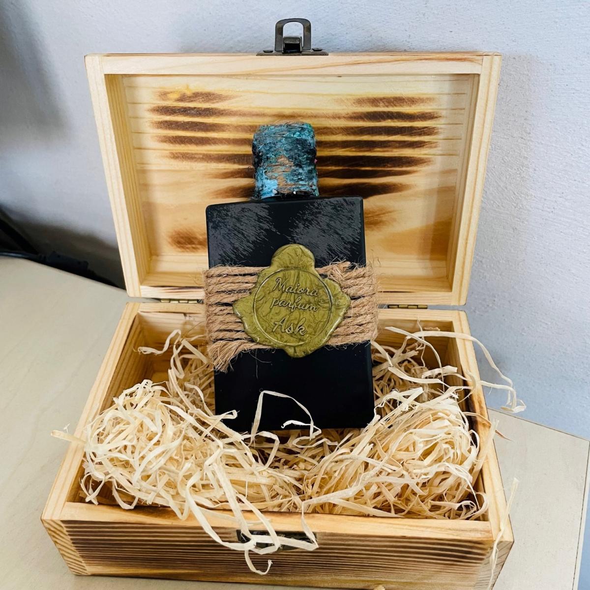Ask podle Maiora Parfum je Aromatic Aquatic vůně pro ženy a muže. Ask byl/a uveden/a v roce 2023. "Nosem" za touto vůní je Antonio Gigli. Vrchní tóny jsou Mořské tóny, Mořská sůl, Jalovcové bobulky a Myrta; střední tóny jsouEukalyptus, Vodní jasmín, Aromatické tóny a Pelargónie ; základní tóny jsou Pačuli, Jantar (ambra), Cedr, Pižmo a Borovice.