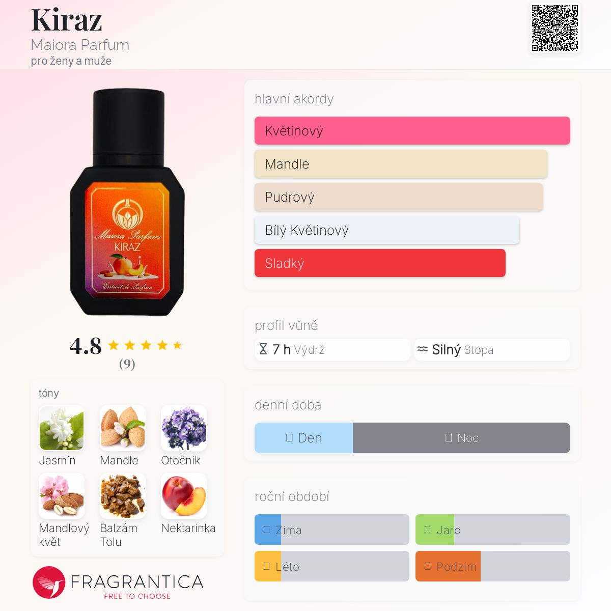 Kiraz podle Maiora Parfum je Orientální Floral vůně pro ženy a muže. Toto je nová vůně. Kiraz byl/a uveden/a v roce 2025. "Nosem" za touto vůní je Antonio Gigli. Vrchní tóny jsou Mandlové mléko, Otočník, Nektarinka a Badyán; střední tóny jsouJasmín, Mandlový květ , Bulharská růže a Vanilka ; základní tóny jsou Balzám Tolu, Santalové dřevo, Jantarové dřevo a Vanilka.
