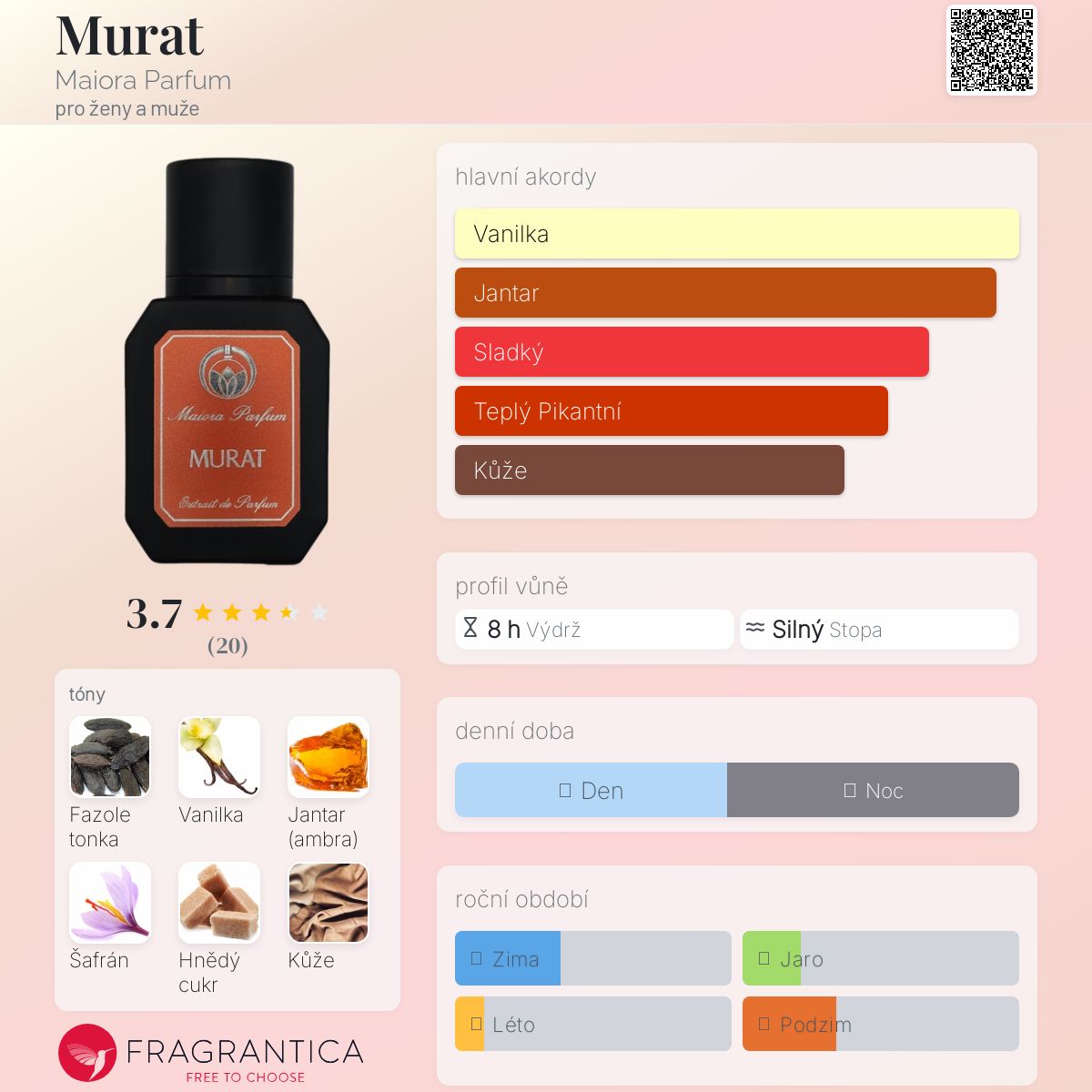 Murat podle Maiora Parfum je Orientální Floral vůně pro ženy a muže. Murat byl/a uveden/a v roce 2023. "Nosem" za touto vůní je Antonio Gigli. Vrchní tóny jsou Šafrán, Černý pepř a Bergamot; střední tóny jsouBulharská růže, Agarové dřevo (oud) a Jasmín ; základní tóny jsou Fazole tonka, Vanilka, Jantar (ambra), Hnědý cukr, Kůže, Benzoin a Bílé pižmo.