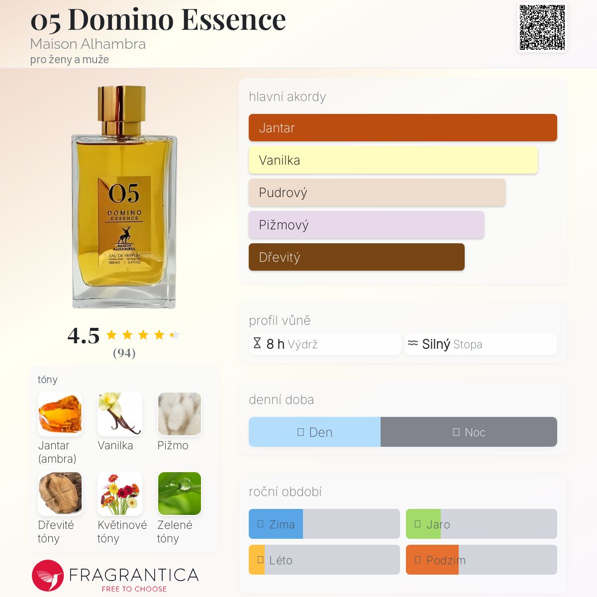 05 Domino Essence podle Maison Alhambra je Orientální vůně pro ženy a muže. 05 Domino Essence byl/a uveden/a v roce 2022. Vrchní tóny jsou Zelené tóny, Ovoce a Citrusy; střední tóny jsouDřevité tóny a Květinové tóny ; základní tóny jsou Jantar (ambra), Vanilka a Pižmo.
