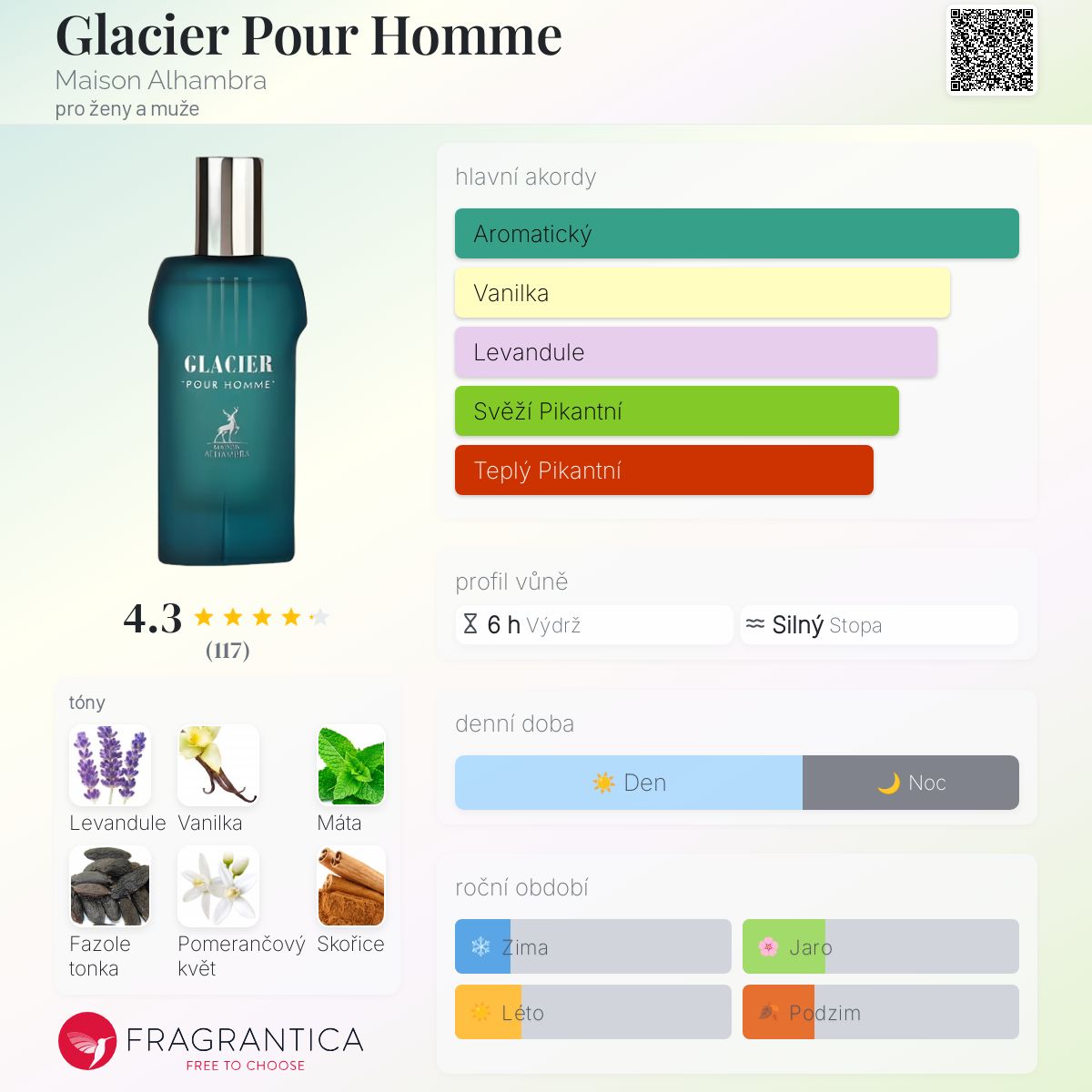 Glacier Pour Homme podle Maison Alhambra je vůně pro ženy a muže. Glacier Pour Homme byl/a uveden/a v roce 2023. Vrchní tóny jsou Levandule, Máta, Kardamom a Bergamot; střední tóny jsouPomerančový květ, Skořice a Kmín ; základní tóny jsou Vanilka, Fazole tonka, Santalové dřevo a Jantar (ambra).