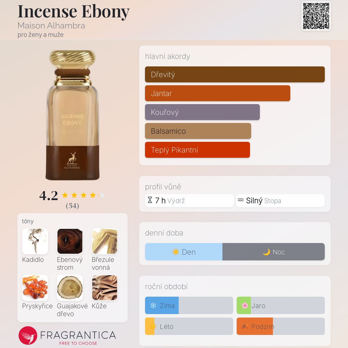 Incense Ebony podle Maison Alhambra je Orientální Woody vůně pro ženy a muže. Toto je nová vůně. Incense Ebony byl/a uveden/a v roce 2024. Vrchní tóny jsou Kadidlo, Březule vonná, Černý pepř a Fialkový list; střední tóny jsouKůže, Labdanum, Cade olej, Papyrus a Růže ; základní tóny jsou Eben, Pryskyřice a Guajakové dřevo.