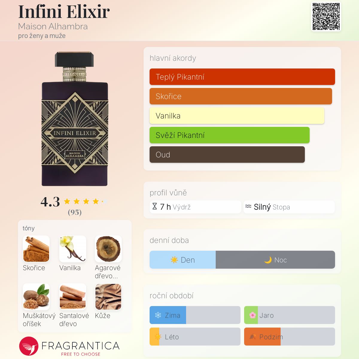 Infini Elixir podle Maison Alhambra je Orientální Woody vůně pro ženy a muže. Infini Elixir byl/a uveden/a v roce 2022. Vrchní tóny jsou Skořice a Muškátový oříšek; střední tóny jsouAgarové dřevo (oud) a Santalové dřevo ; základní tóny jsou Vanilka, Kůže a Jantar (ambra).