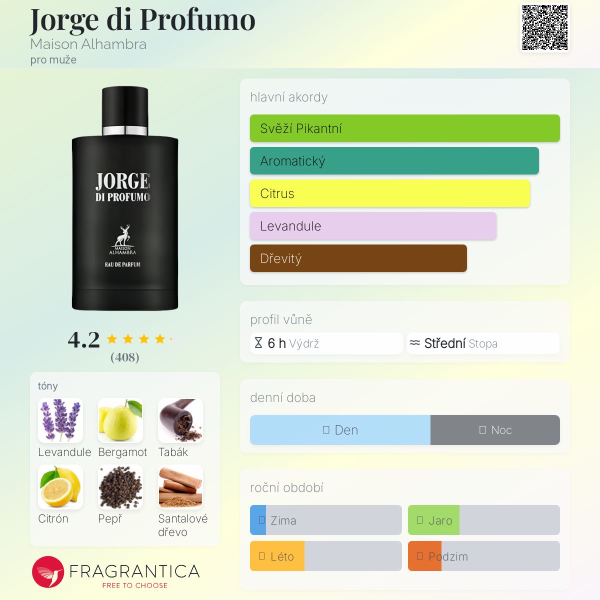 Jorge di Profumo podle Maison Alhambra je Aromatic vůně pro muže. Jorge di Profumo byl/a uveden/a v roce 2022. Vrchní tóny jsou Bergamot, Sicilský citron a Černý pepř; střední tóny jsouLevandule, Tabák a Pelargónie ; základní tóny jsou Santalové dřevo, Pižmo a Vetiver.