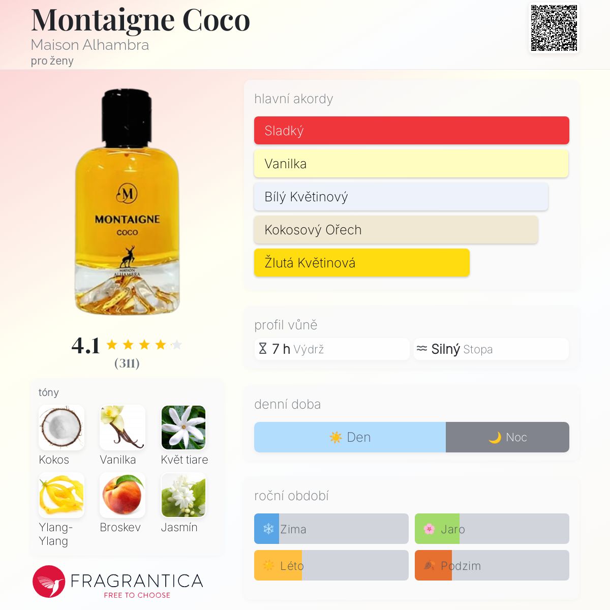 Montaigne Coco podle Maison Alhambra je Orientální Floral vůně pro ženy. Vrchní tóny jsou Kokos a Broskev; střední tóny jsouKvět tiare, Ylang-Ylang a Jasmín ; základní tóny jsou Vanilka, Bílé pižmo a Dřevité tóny.