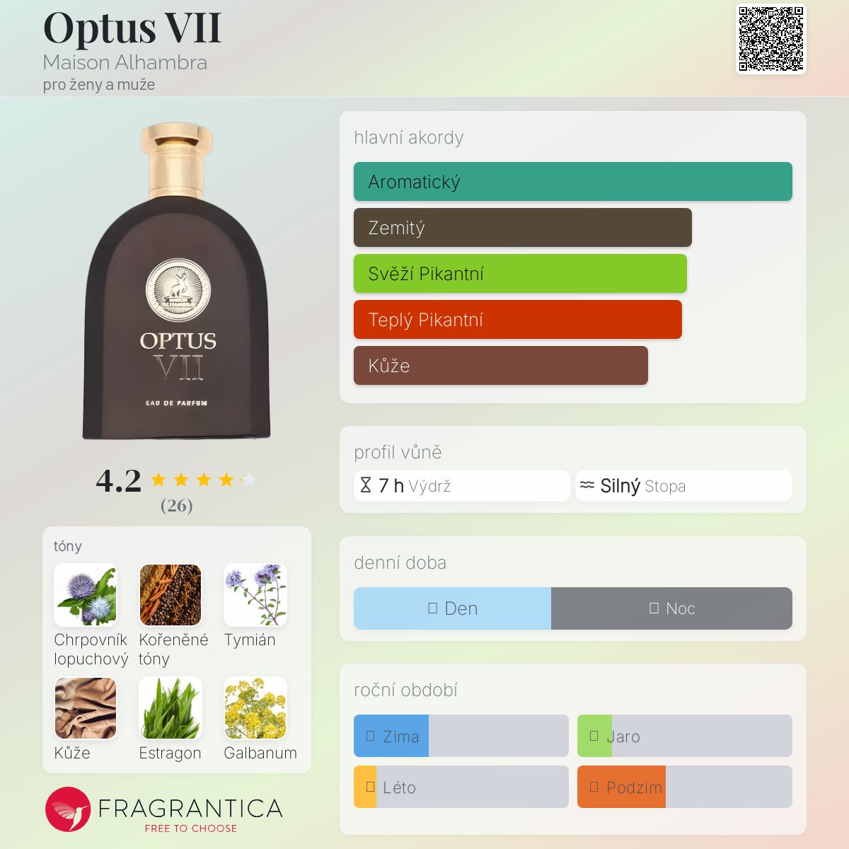 Optus VII podle Maison Alhambra je Aromatic vůně pro ženy a muže. Optus VII byl/a uveden/a v roce 2022. Vrchní tóny jsou Koření, Tymián, Estragon a Růžový pepř; střední tóny jsouChrpovník lopuchový a Galbanum ; základní tóny jsou Kůže a Pačuli.