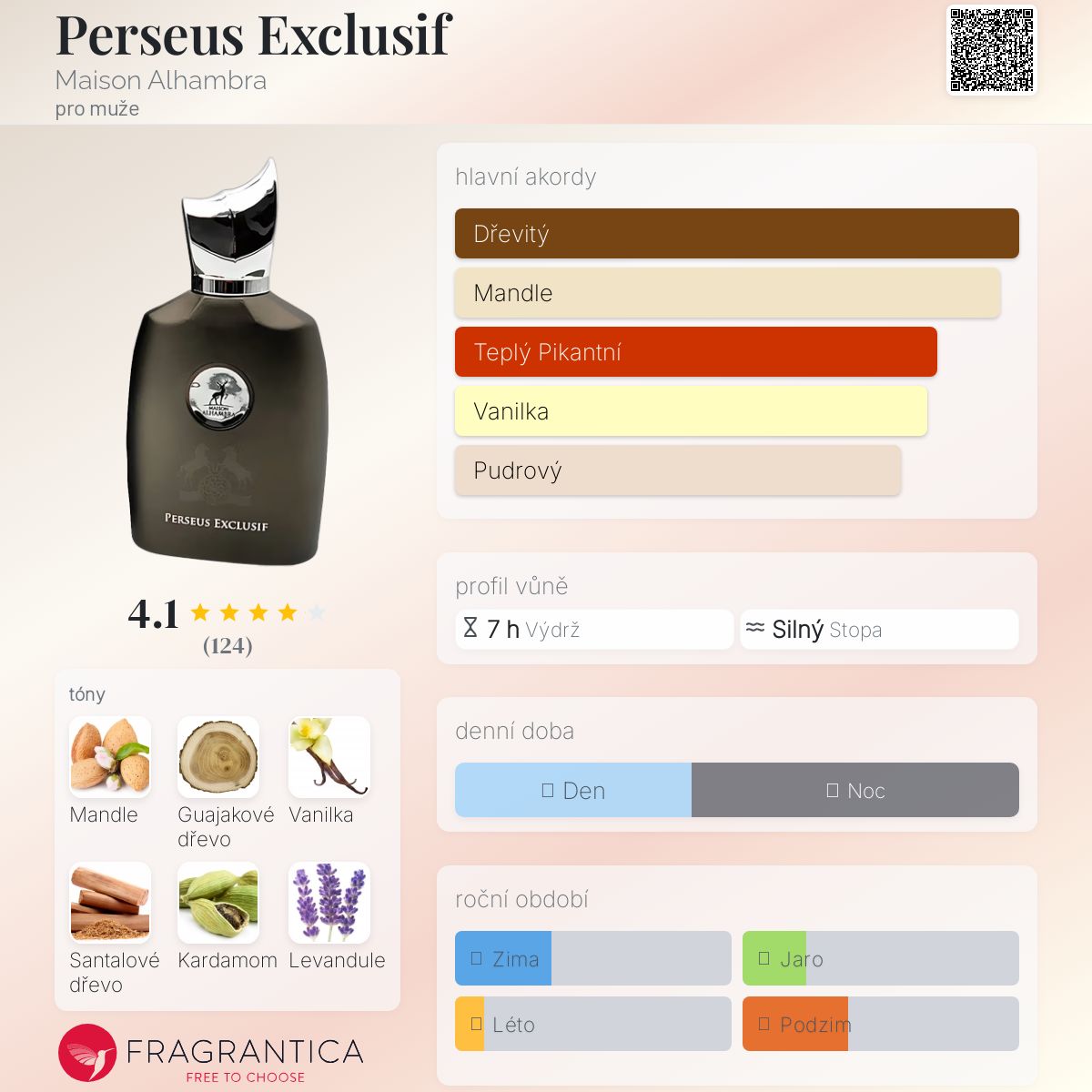 Perseus Exclusif podle Maison Alhambra je Woody Aromatic vůně pro muže. Perseus Exclusif byl/a uveden/a v roce 2023. Vrchní tóny jsou Kardamom, Otočník, Červená paprička a Bergamot; střední tóny jsouMandle, Levandule, Jasmín a Pelargónie ; základní tóny jsou Guajakové dřevo, Vanilka, Santalové dřevo a Ambra.