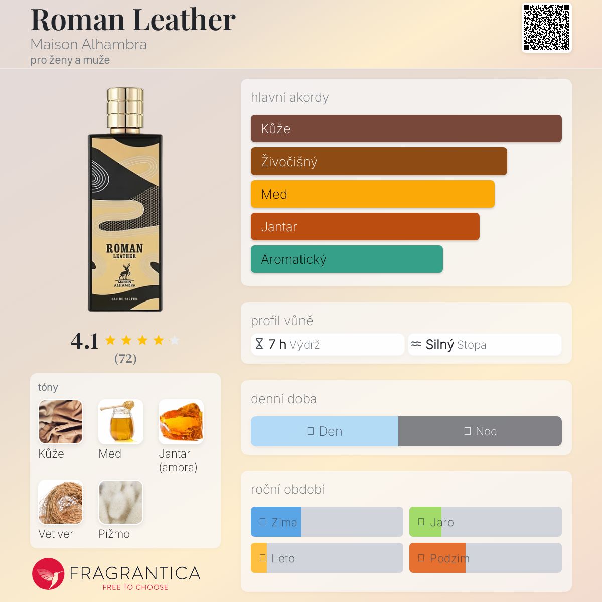 Roman Leather podle Maison Alhambra je Leather vůně pro ženy a muže. Roman Leather byl/a uveden/a v roce 2022. Vrchní tóny jsou Kůže a Pižmo; střední tóny jsouMed a Vetiver ; základní tón je Jantar (ambra).
