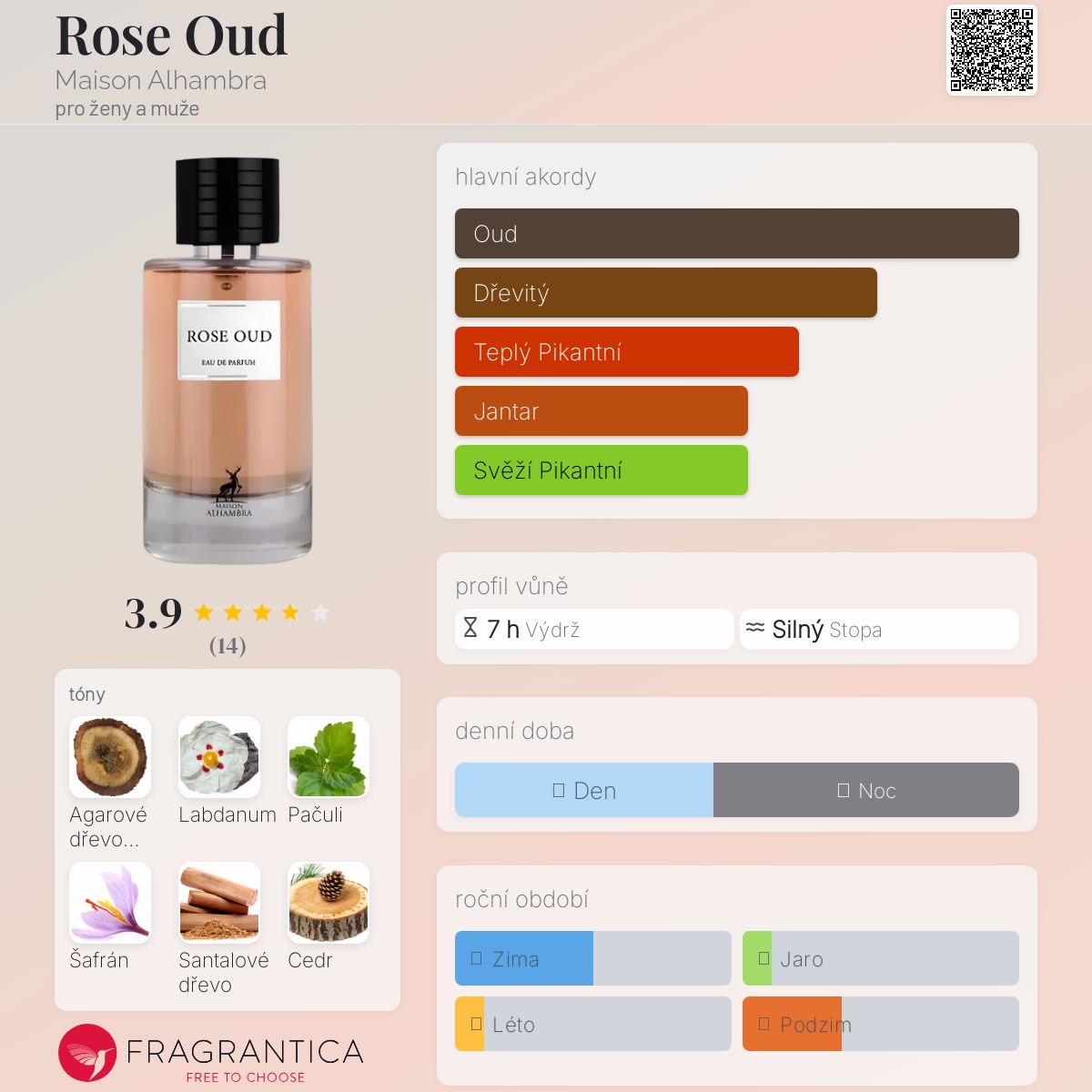 Rose Oud podle Maison Alhambra je Orientální Woody vůně pro ženy a muže. Rose Oud byl/a uveden/a v roce 2022. Vrchní tón je Labdanum ; střední tóny jsouPačuli, Šafrán a Růže ; základní tóny jsou Agarové dřevo (oud), Agarové dřevo (oud), Santalové dřevo a Cedr.