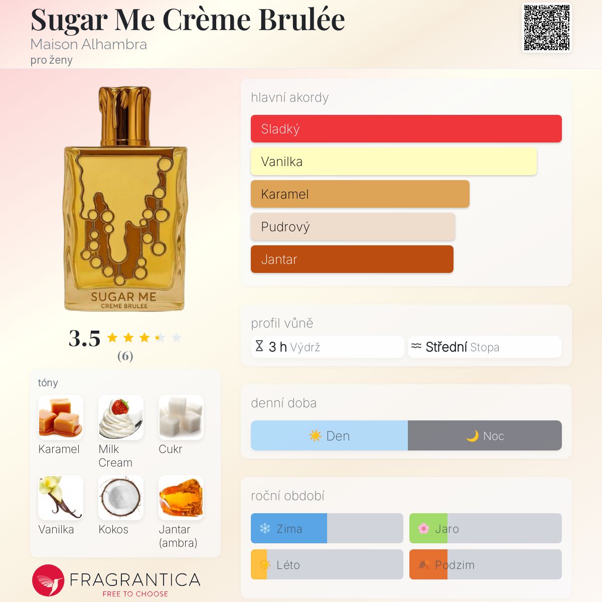Sugar Me Crème Brulée podle Maison Alhambra je Orientální Vanilla vůně pro ženy. Toto je nová vůně. Sugar Me Crème Brulée byl/a uveden/a v roce 2025. Vrchní tóny jsou Karamel a Vanilka; střední tóny jsouCukr, Mléčný krém, Kokos a Fazole tonka ; základní tóny jsou Jantar (ambra), Santalové dřevo a Pižmo.