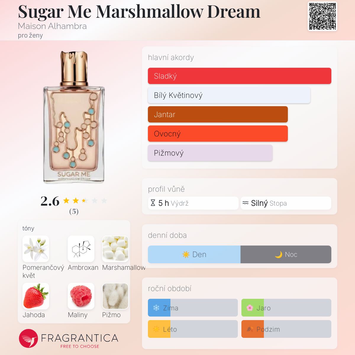 Sugar Me Marshmallow Dream podle Maison Alhambra je Floral Fruity Gourmand vůně pro ženy. Toto je nová vůně. Sugar Me Marshmallow Dream byl/a uveden/a v roce 2025. Vrchní tóny jsou Jahoda a Maliny; střední tóny jsouPomerančový květ a Ambroxan ; základní tóny jsou Marshamallow a Pižmo.