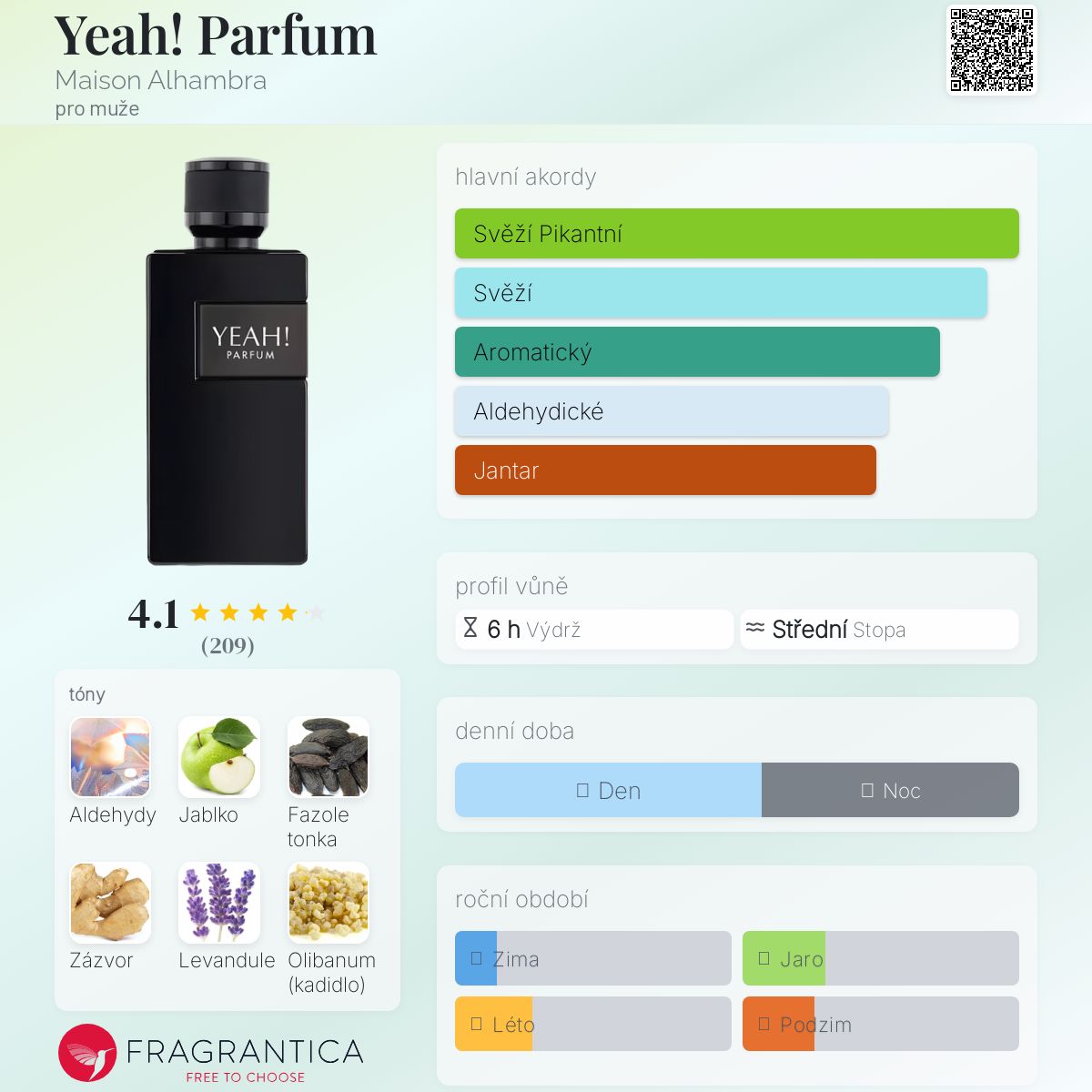Yeah! Parfum podle Maison Alhambra je Aromatic vůně pro muže. Yeah! Parfum byl/a uveden/a v roce 2022. Vrchní tóny jsou Aldehydy, Jablko, Zázvor a Grapefruit; střední tóny jsouLevandule, Šalvěj a Pelargónie ; základní tóny jsou Fazole tonka, Kadidlo, Cedr a Pačuli.