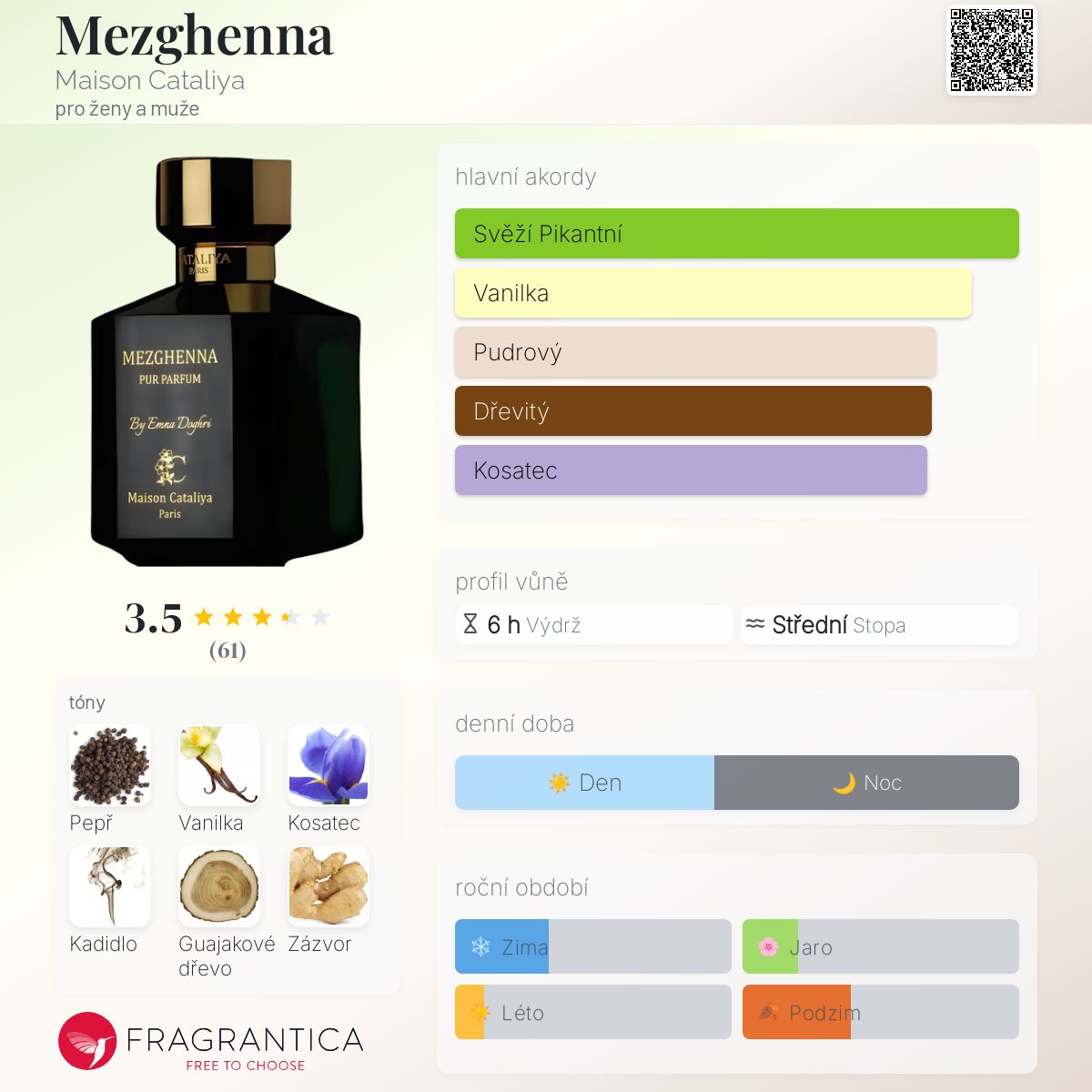 Mezghenna podle Maison Cataliya je Orientální Spicy vůně pro ženy a muže. Toto je nová vůně. Mezghenna byl/a uveden/a v roce 2025. "Nosem" za touto vůní je Emna Doghri. Vrchní tóny jsou Černý pepř a Bergamot; střední tóny jsouGuajakové dřevo a Zázvor ; základní tóny jsou Vanilka, Kosatec a Kadidlo.