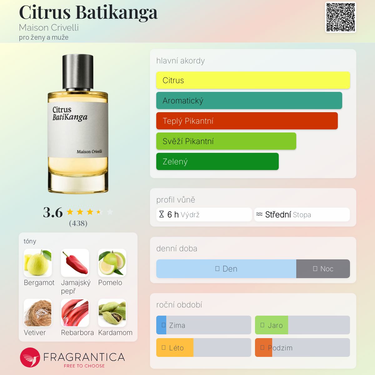Citrus Batikanga podle Maison Crivelli je Citrus vůně pro ženy a muže. Citrus Batikanga byl/a uveden/a v roce 2019. "Nosem" za touto vůní je Bertrand Duchaufour. Vrchní tóny jsou Bergamot a Kardamom; střední tóny jsouChilli papričky, Pomelo a Rebarbora ; základní tóny jsou Vetiver, Myrha a Pískavice řecké seno.