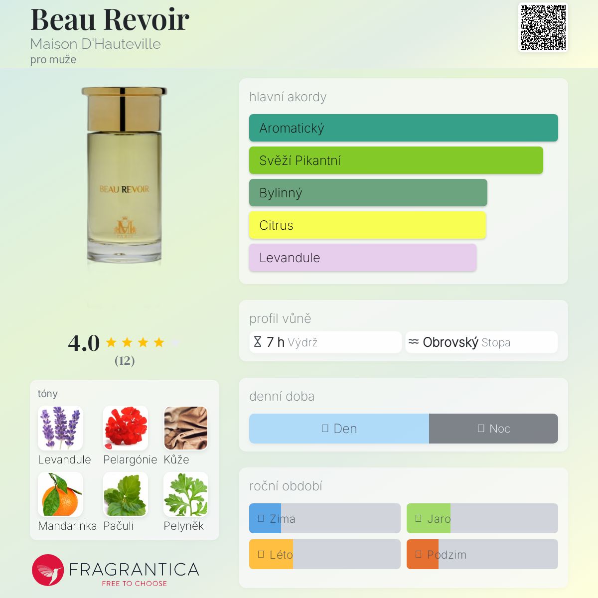 Beau Revoir podle Maison D'Hauteville je Woody Aromatic vůně pro muže. Beau Revoir byla spuštěna během 2010. Beau Revoir byl/a vytvořen/a Stéphanie d\'Hauteville, Arthur d\'Hauteville a Thomas d\'Hauteville. Vrchní tóny jsou Kůže, Mandarinka, Pačuli, Bergamot, Petitgrain, Fazole tonka, Cedr a Květinové tóny; střední tóny jsouLevandule, Pelargónie, Pelyněk a Hřebíček ; základní tóny jsou Pačuli, Fazole tonka a Cedr.