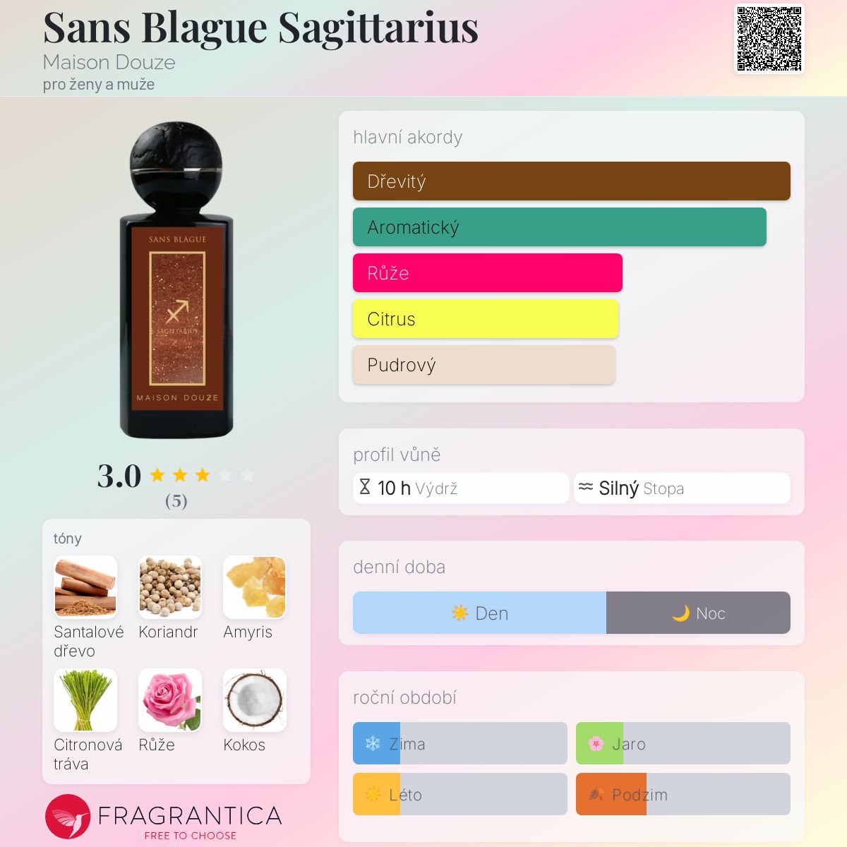 Sans Blague Sagittarius podle Maison Douze je vůně pro ženy a muže. Sans Blague Sagittarius byl/a uveden/a v roce 2023. "Nosem" za touto vůní je Amelie Bourgeois. Vrchní tóny jsou Koriandr a Citronová tráva; střední tóny jsouRůže a Kokos ; základní tóny jsou Santalové dřevo a Amyris.