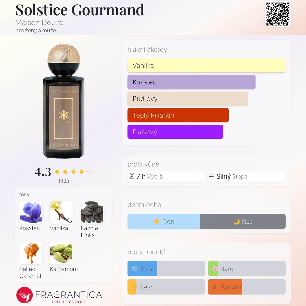 Solstice Gourmand podle Maison Douze je vůně pro ženy a muže. Toto je nová vůně. Solstice Gourmand byl/a uveden/a v roce 2024. Vrchní tón je Kardamom ; střední tóny jsouKosatec a Fazole tonka ; základní tóny jsou Vanilka a Salted Caramel.