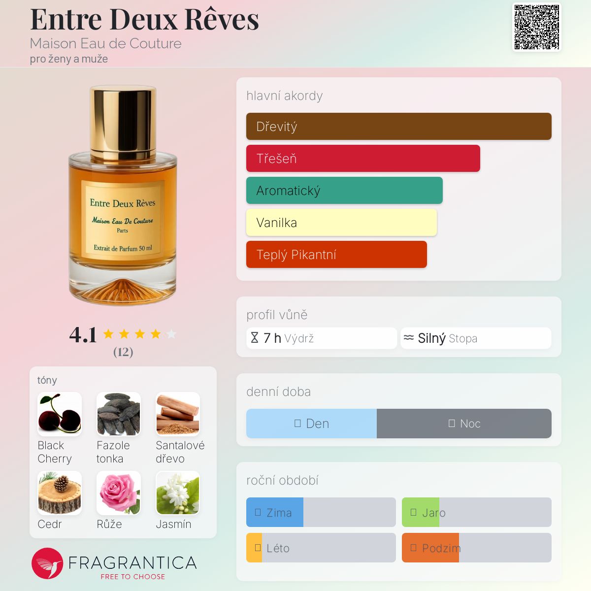 Entre Deux Rêves podle Maison Eau de Couture je Orientální vůně pro ženy a muže. Entre Deux Rêves byl/a uveden/a v roce 2018. "Nosem" za touto vůní je Nejla Barbir. Vrchní tóny jsou Černá třešeň a Coca-Cola; střední tóny jsouFazole tonka, Růže a Jasmín ; základní tóny jsou Santalové dřevo, Cedr a Vetiver.