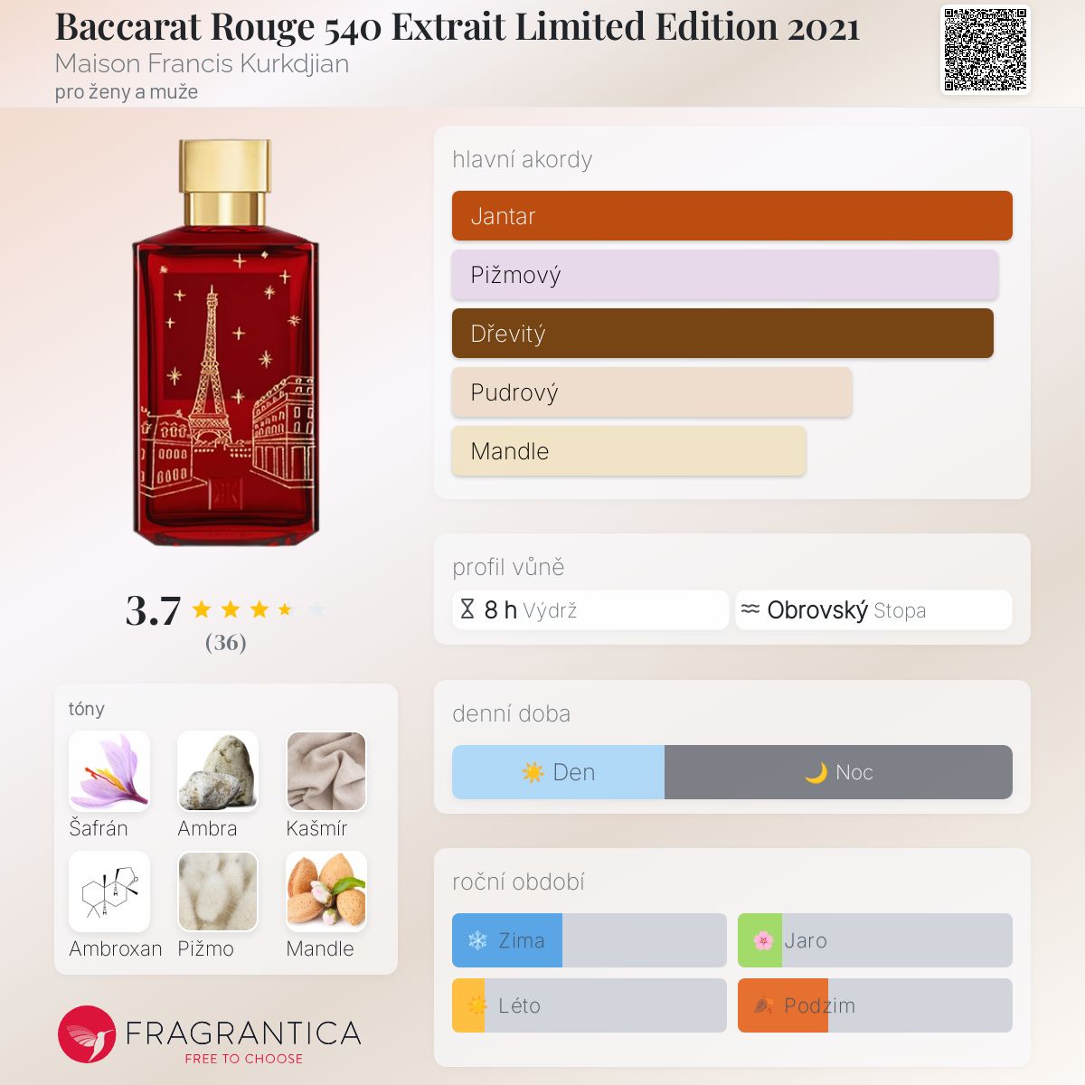 Baccarat Rouge 540 Extrait Limited Edition 2021 podle Maison Francis Kurkdjian je vůně pro ženy a muže. Baccarat Rouge 540 Extrait Limited Edition 2021 byl/a uveden/a v roce 2021. "Nosem" za touto vůní je Francis Kurkdjian. Vrchní tóny jsou Šafrán a Hořká mandle; střední tóny jsouVirginský cedr a Egyptský jasmín ; základní tóny jsou Ambra, Kašmír, Ambroxan, Pižmo a Dřevité tóny.