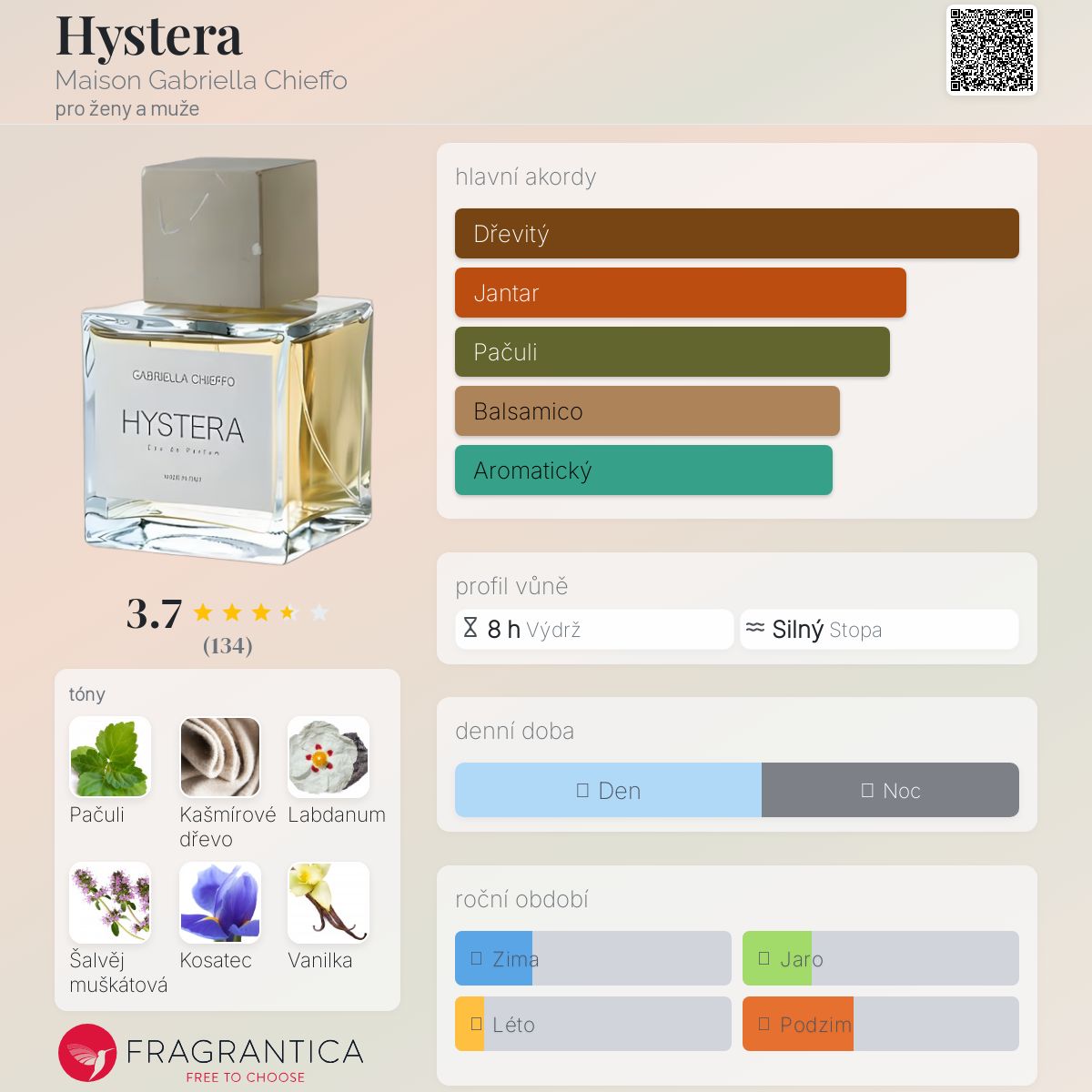 Hystera podle Maison Gabriella Chieffo je vůně pro ženy a muže. Hystera byl/a uveden/a v roce 2014. "Nosem" za touto vůní je Luca Maffei. Vrchní tóny jsou Šalvěj muškátová a Bergamot; střední tón jeKosatec ; základní tóny jsou Pačuli, Kašmírové dřevo, Labdanum a Vanilka.