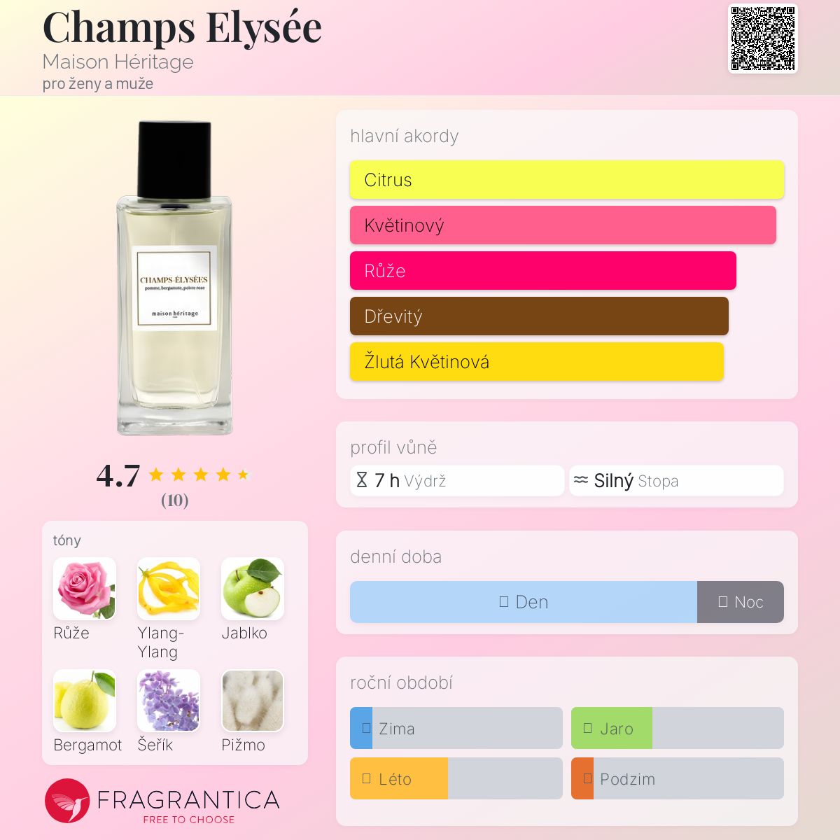 Champs Elysée podle Maison Héritage je Orientální Floral vůně pro ženy a muže. Champs Elysée byl/a uveden/a v roce 2021. "Nosem" za touto vůní je Nejla Barbir. Vrchní tóny jsou Zelené jablko, Bergamot a Růžový pepř; střední tóny jsouRůže, Ylang-Ylang, Šeřík a Citrón ; základní tóny jsou Pižmo, Pačuli, Jantar (ambra) a Santalové dřevo.