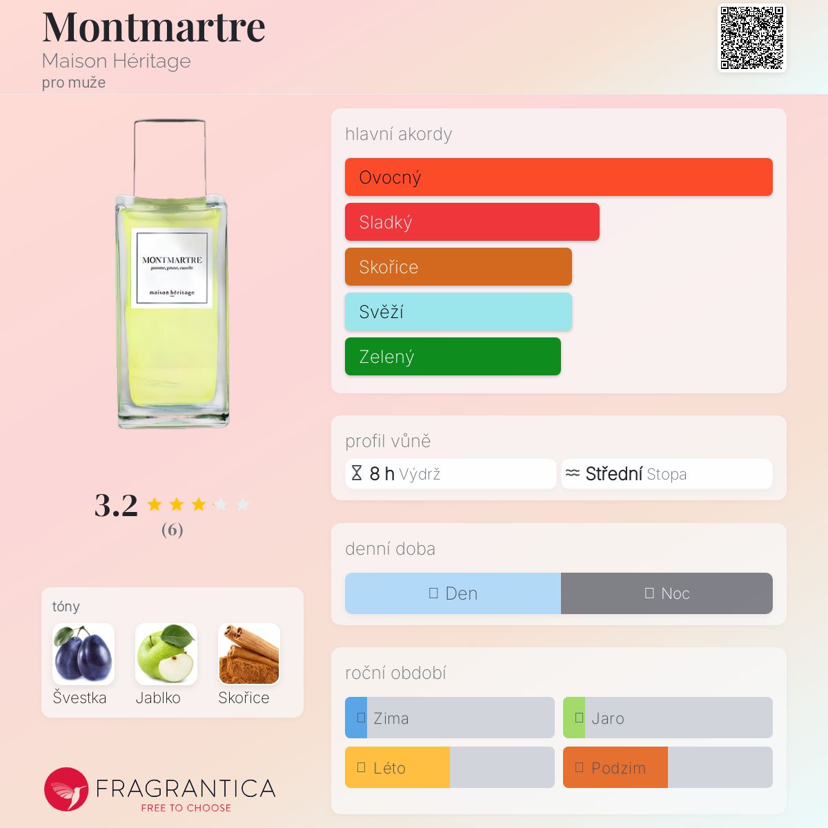 Montmartre podle Maison Héritage je Aromatic Fruity vůně pro muže. Montmartre byl/a uveden/a v roce 2021. "Nosem" za touto vůní je Nejla Barbir.