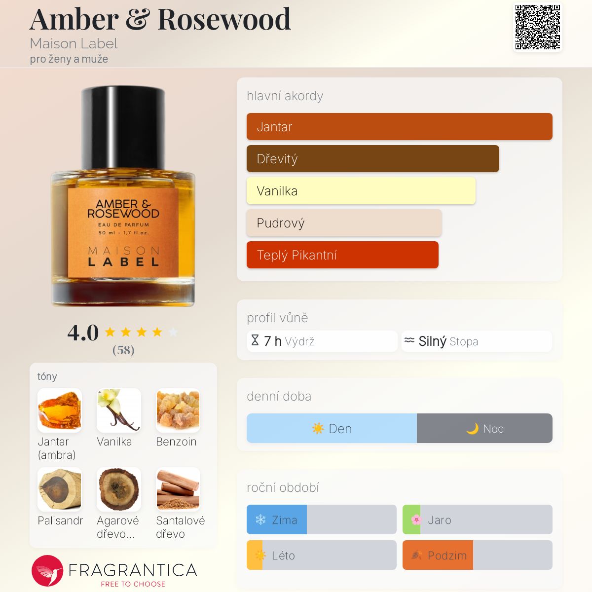 Amber & Rosewood podle Maison Label je Orientální Spicy vůně pro ženy a muže. Amber & Rosewood byl/a uveden/a v roce 2020. "Nosem" za touto vůní je Angela Ciampagna. Vrchní tóny jsou Muškátový oříšek, Citrón a Bergamot; střední tóny jsouPalisandr, Agarové dřevo (oud) a Cedr ; základní tóny jsou Jantar (ambra), Vanilka, Benzoin a Santalové dřevo.
