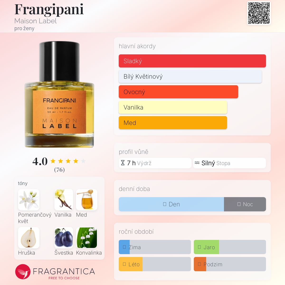 Frangipani podle Maison Label je Floral Fruity vůně pro ženy. Frangipani byl/a uveden/a v roce 2020. "Nosem" za touto vůní je Angela Ciampagna. Vrchní tóny jsou Pomerančový květ a Konvalinka; střední tóny jsouHruška a Švestka ; základní tóny jsou Vanilka, Med a Guajakové dřevo.