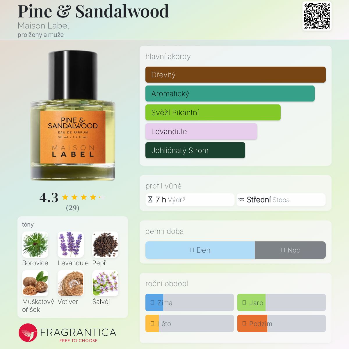 Pine & Sandalwood podle Maison Label je vůně pro ženy a muže. Pine & Sandalwood byla spuštěna během 2020. Vrchní tóny jsou Černý pepř, Muškátový oříšek a Bergamot; střední tóny jsouBorovice, Levandule, Vetiver a Šalvěj ; základní tóny jsou Santalové dřevo, Pačuli a Dubový mech.