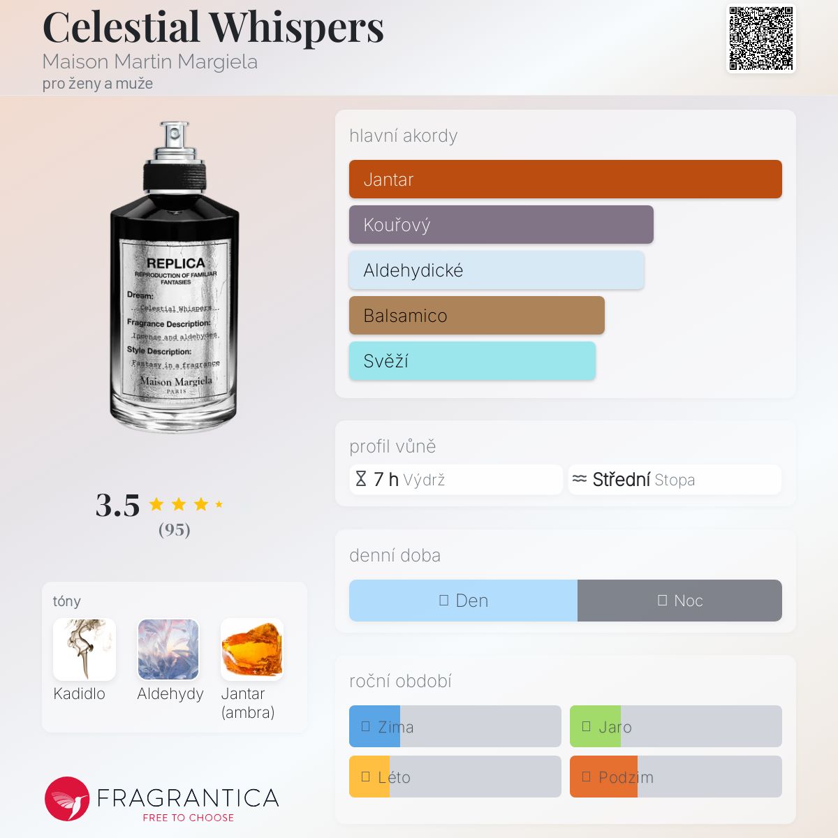 Celestial Whispers podle Maison Martin Margiela je Orientální Woody vůně pro ženy a muže. Toto je nová vůně. Celestial Whispers byl/a uveden/a v roce 2025.