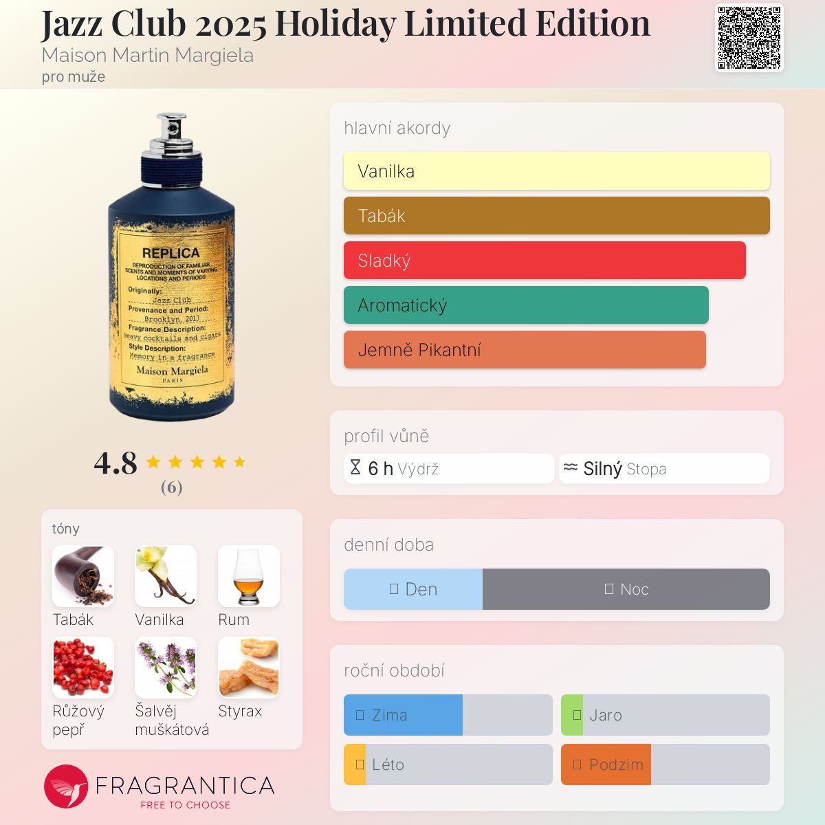 Jazz Club 2025 Holiday Limited Edition podle Maison Martin Margiela je Orientální Spicy vůně pro muže. Toto je nová vůně. Jazz Club 2025 Holiday Limited Edition byl/a uveden/a v roce 2025. "Nosem" za touto vůní je Alienor Massenet. Vrchní tóny jsou Růžový pepř, Neroli a Citrón; střední tóny jsouRum, Šalvěj muškátová a Java vetiverový olej ; základní tóny jsou Vanilka, Tabákový list a Styrax.