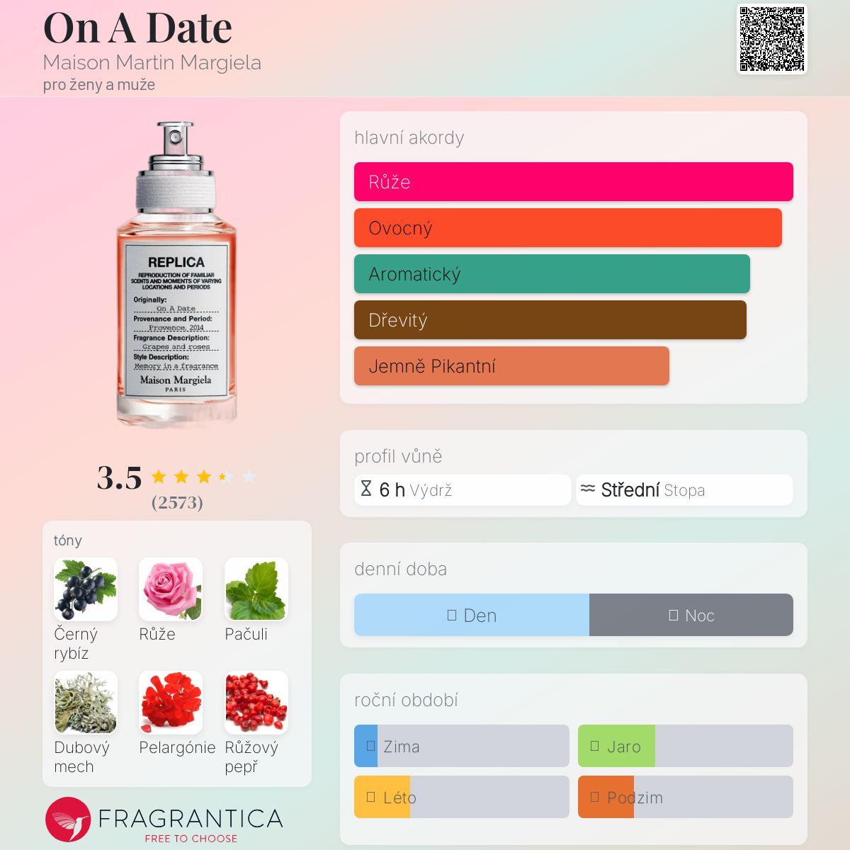 On A Date podle Maison Martin Margiela je Floral Fruity vůně pro ženy a muže. Toto je nová vůně. On A Date byl/a uveden/a v roce 2022. "Nosem" za touto vůní je Carlos Benaïm. Vrchní tóny jsou Sirup z černého rybízu, Růžový pepř a Bergamot; střední tóny jsouRůže, Pelargónie a Davana ; základní tóny jsou Pačuli, Mech, Pižmo a Vetiver.
