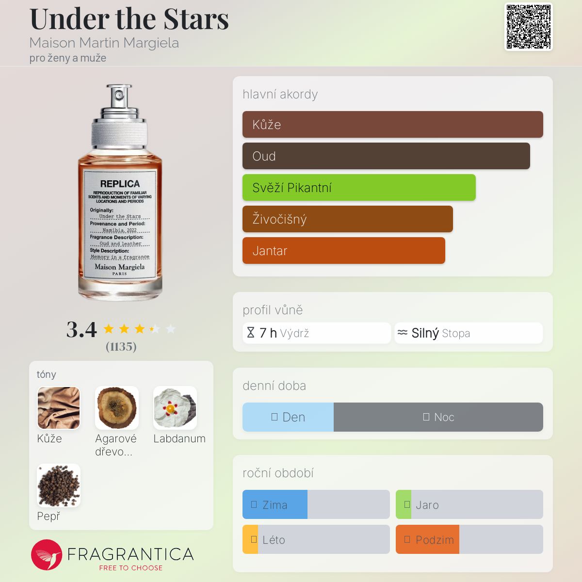 Under the Stars podle Maison Martin Margiela je Orientální Woody vůně pro ženy a muže. Toto je nová vůně. Under the Stars byl/a uveden/a v roce 2023. "Nosem" za touto vůní je Meabh McCurtin. Vrchní tón je Černý pepř ; střední tón jeKůže ; základní tóny jsou Agarové dřevo (oud) a Labdanum.