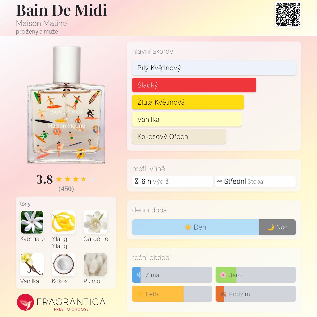 Bain De Midi podle Maison Matine je Orientální Floral vůně pro ženy a muže. Bain De Midi byl/a uveden/a v roce 2019. "Nosem" za touto vůní je Philippine Courtière. Vrchní tóny jsou Kokos a Bergamot; střední tóny jsouKvět tiare, Ylang-Ylang a Gardénie ; základní tóny jsou Vanilka a Pižmo.