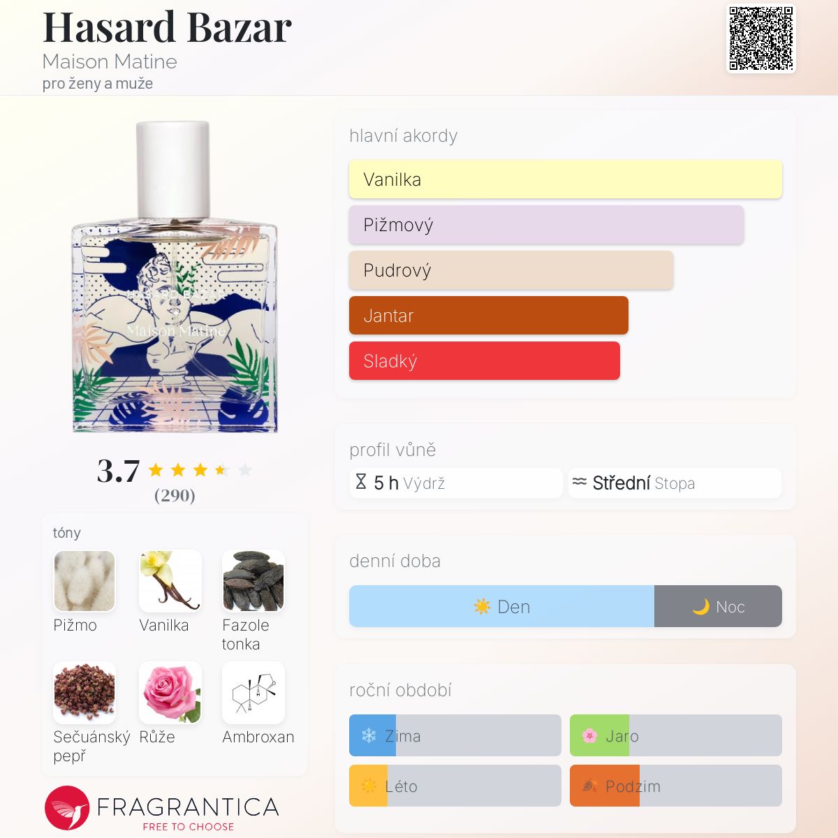Hasard Bazar podle Maison Matine je Orientální Vanilla vůně pro ženy a muže. Hasard Bazar byl/a uveden/a v roce 2019. Hasard Bazar byl/a vytvořen/a Ane Ayo a Fabrice Pellegrin. Vrchní tón je Sečuánský pepř ; střední tóny jsouRůže a Ambroxan ; základní tóny jsou Pižmo, Vanilka, Fazole tonka a Pačuli.