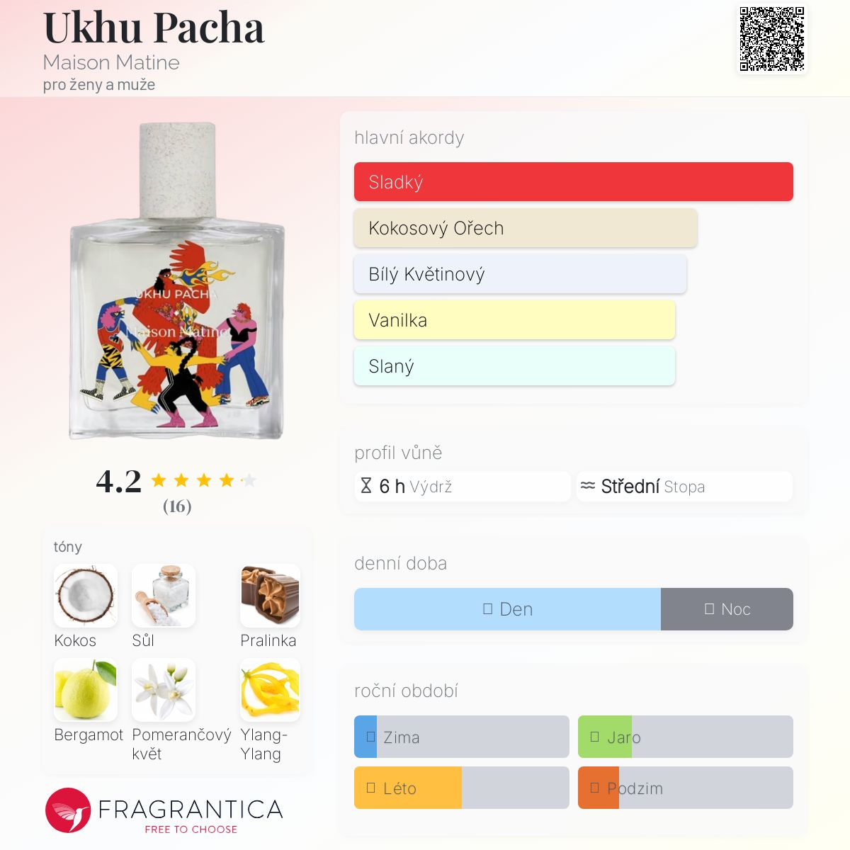 Ukhu Pacha podle Maison Matine je vůně pro ženy a muže. Vrchní tóny jsou Kokos, Mořská sůl a Bergamot; střední tóny jsouYlang-Ylang, Pomerančový květ, Tuberóza, Kumarin a Jasmín ; základní tóny jsou Pralinka, Naplavené dříví a Vanilka.
