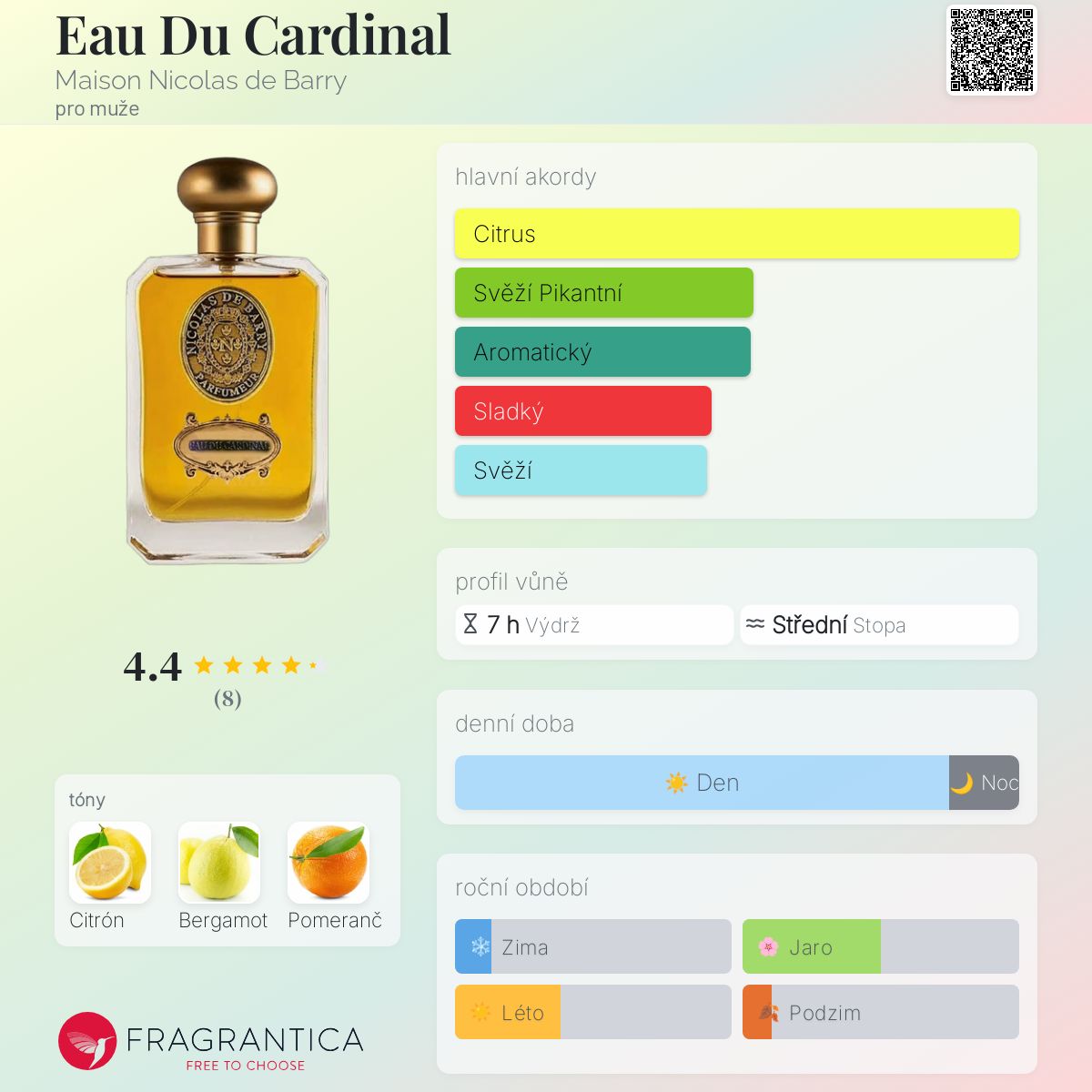 Eau Du Cardinal podle Maison Nicolas de Barry je Citrus vůně pro muže. Eau Du Cardinal byl/a uveden/a v roce 2014. "Nosem" za touto vůní je Nicolas de Barry.