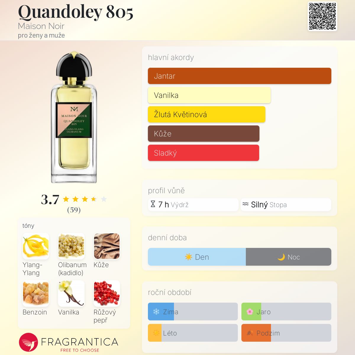 Quandoley 805 podle Maison Noir je Orientální Spicy vůně pro ženy a muže. Toto je nová vůně. Quandoley 805 byl/a uveden/a v roce 2024. "Nosem" za touto vůní je Guillaume Flavigny. Vrchní tóny jsou Růžový pepř, Oliva a Labdanum; střední tóny jsouYlang-Ylang, Olibanum, Kůže a Styrax ; základní tóny jsou Benzoin, Vanilka a Agarové dřevo (oud).
