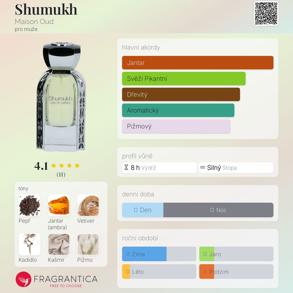 Shumukh podle Maison Oud je vůně pro muže. Shumukh byl/a uveden/a v roce 2021. Vrchní tóny jsou Pepř, Bergamot a Šalvěj muškátová; střední tóny jsouJantar (ambra) a Kašmír ; základní tóny jsou Vetiver, Kadidlo a Pižmo.