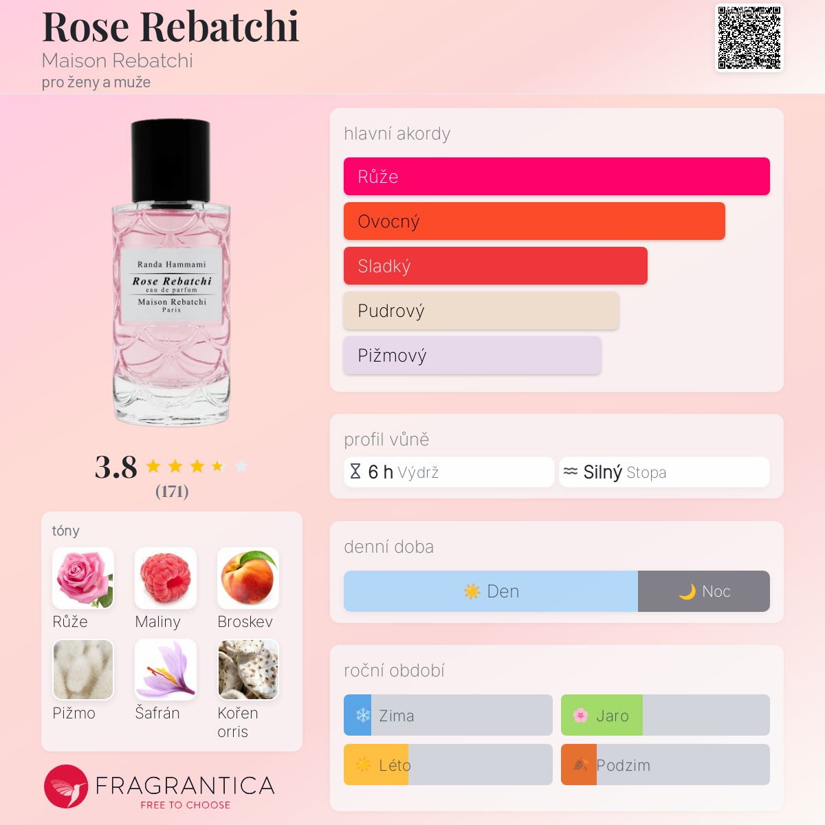 Rose Rebatchi podle Maison Rebatchi je vůně pro ženy a muže. Rose Rebatchi byl/a uveden/a v roce 2018. "Nosem" za touto vůní je Randa Hammami. Vrchní tóny jsou Maliny, Broskev, Šafrán, Růžový pepř a Jablko; střední tóny jsouDamašská růže, Turecká růže a Kořen orris ; základní tóny jsou Bílé pižmo, Santalové dřevo, Ambra a Cedr.