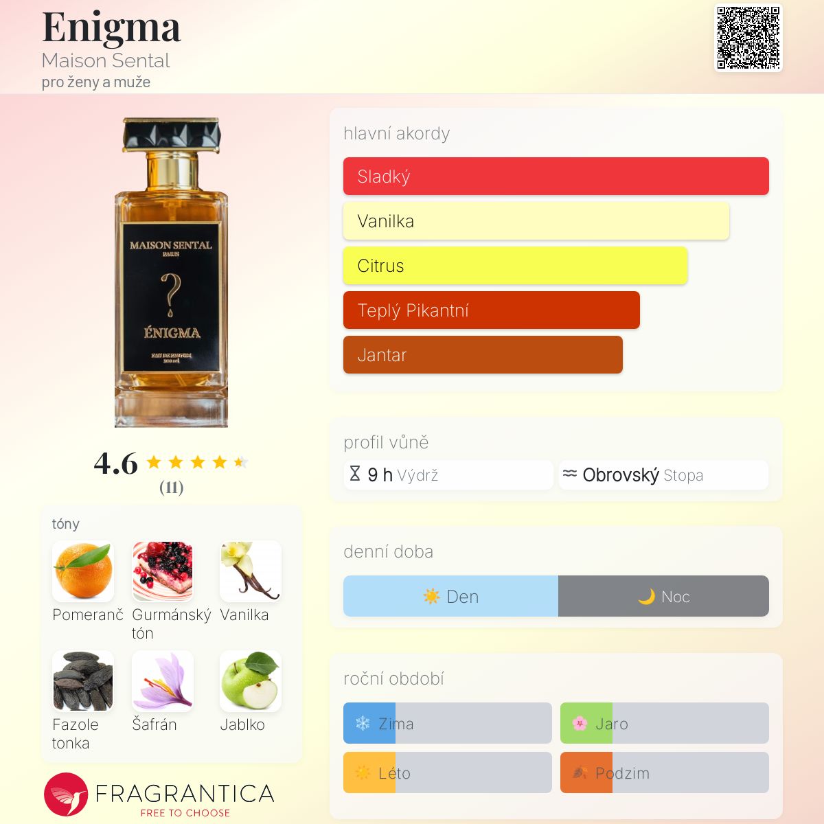 Enigma podle Maison Sental je Orientální Floral vůně pro ženy a muže. Toto je nová vůně. Enigma byl/a uveden/a v roce 2025. "Nosem" za touto vůní je Nathalie Feisthauer. Vrchní tóny jsou Sladký pomeranč, Šafrán a Jablko; střední tóny jsouPomeranč, Turecká růže, Ylang-Ylang a Jasmín ; základní tóny jsou Gurmánský tón, Vanilka, Fazole tonka, Madagaskarská vanilka, Kašmírové pižmo, Santalové dřevo a Ambroxan.