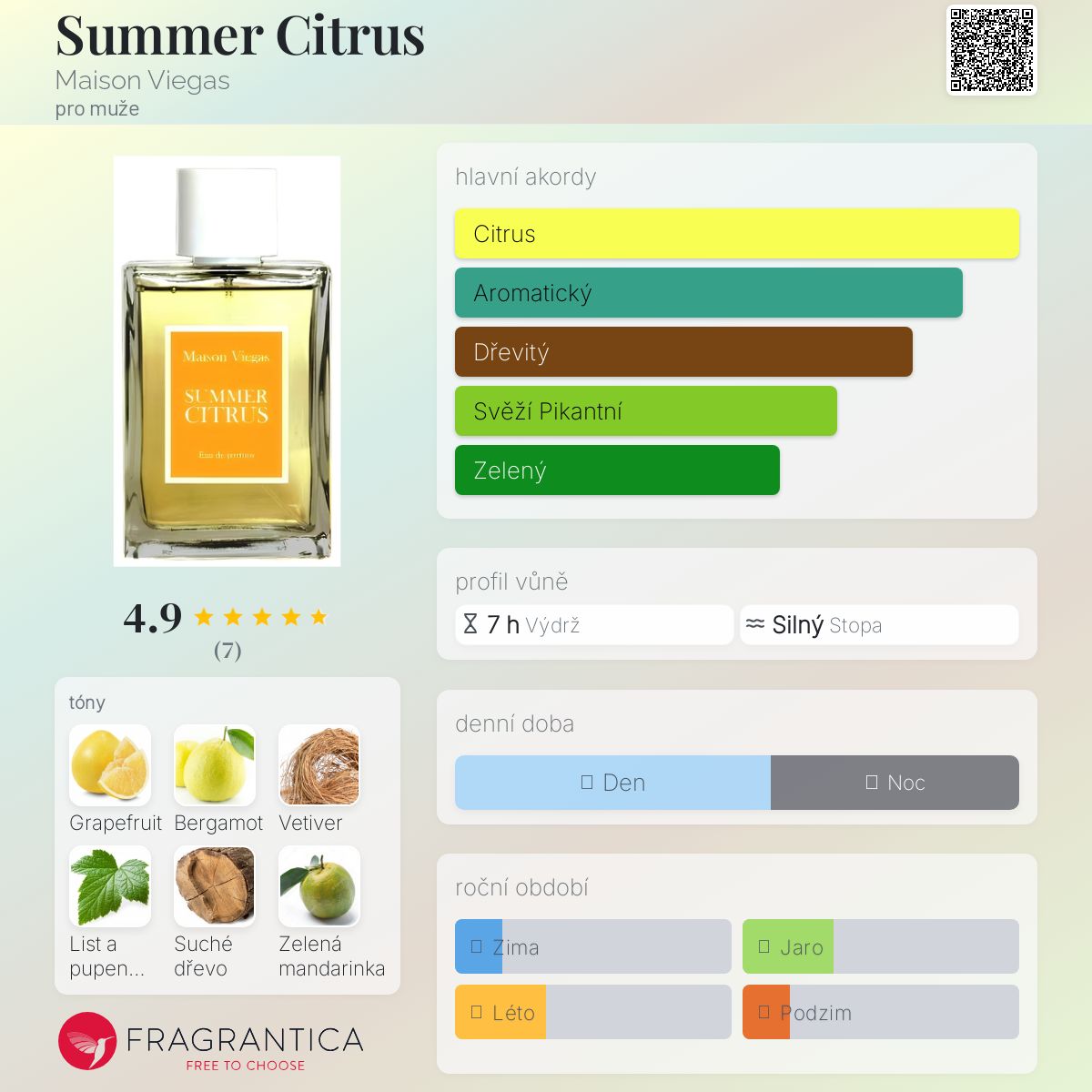 Summer Citrus podle Maison Viegas je Woody Aromatic vůně pro muže. Toto je nová vůně. Summer Citrus byl/a uveden/a v roce 2025. Vrchní tóny jsou Grapefruit, Bergamot a Poupata rybízu; střední tóny jsouVetiver, Zelená mandarinka a Pelargónie ; základní tóny jsou Suché dřevo, Ambra a Kašmírové dřevo.