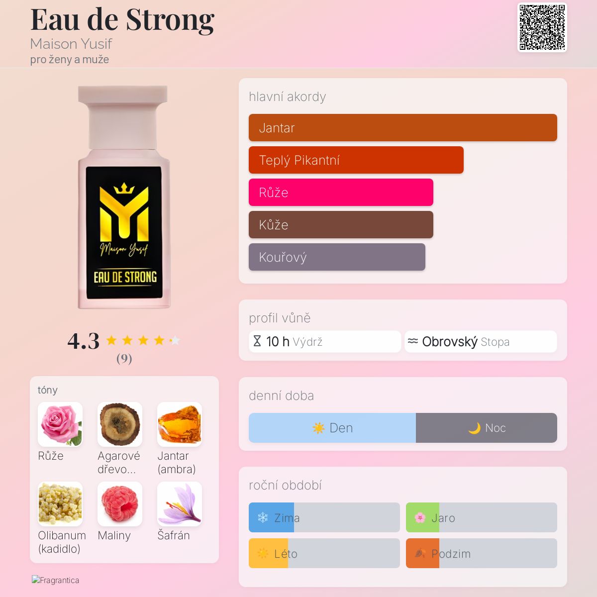 Eau de Strong podle Maison Yusif je Orientální Floral vůně pro ženy a muže. Eau de Strong byl/a uveden/a v roce 2022. "Nosem" za touto vůní je Yusif Meizongo Jnr. Vrchní tóny jsou Růže, Olibanum, Maliny a Šafrán; střední tóny jsouRůže, Benzoin, Kůže a Kadidlo ; základní tóny jsou Agarové dřevo (oud), Jantar (ambra), Růže, Kůže a Kadidlo.