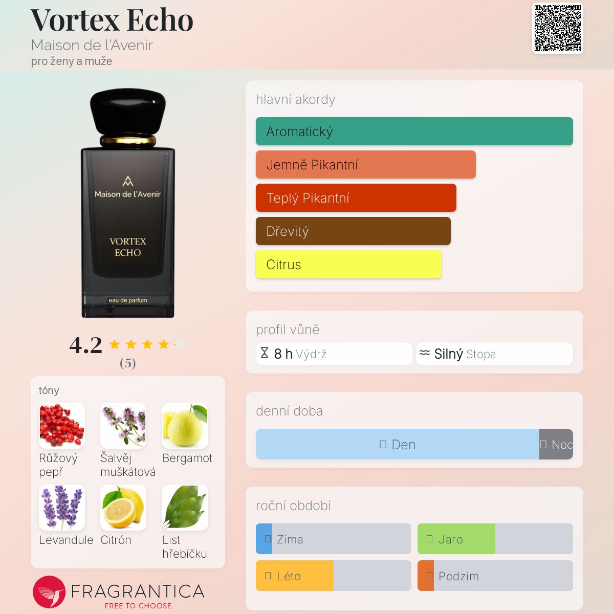 Vortex Echo podle Maison de l'Avenir je Aromatic Spicy vůně pro ženy a muže. Toto je nová vůně. Vortex Echo byl/a uveden/a v roce 2024. Vrchní tóny jsou Růžový pepř, Šalvěj muškátová, Bergamot, Levandule a Citrón; střední tóny jsouList hřebíčku, Koriandr, Kardamom, Kasie, Tymián a Šalvěj ; základní tóny jsou Pačuli, Vanilka, Kůže, Vetiver, Tabák a Jantar (ambra).