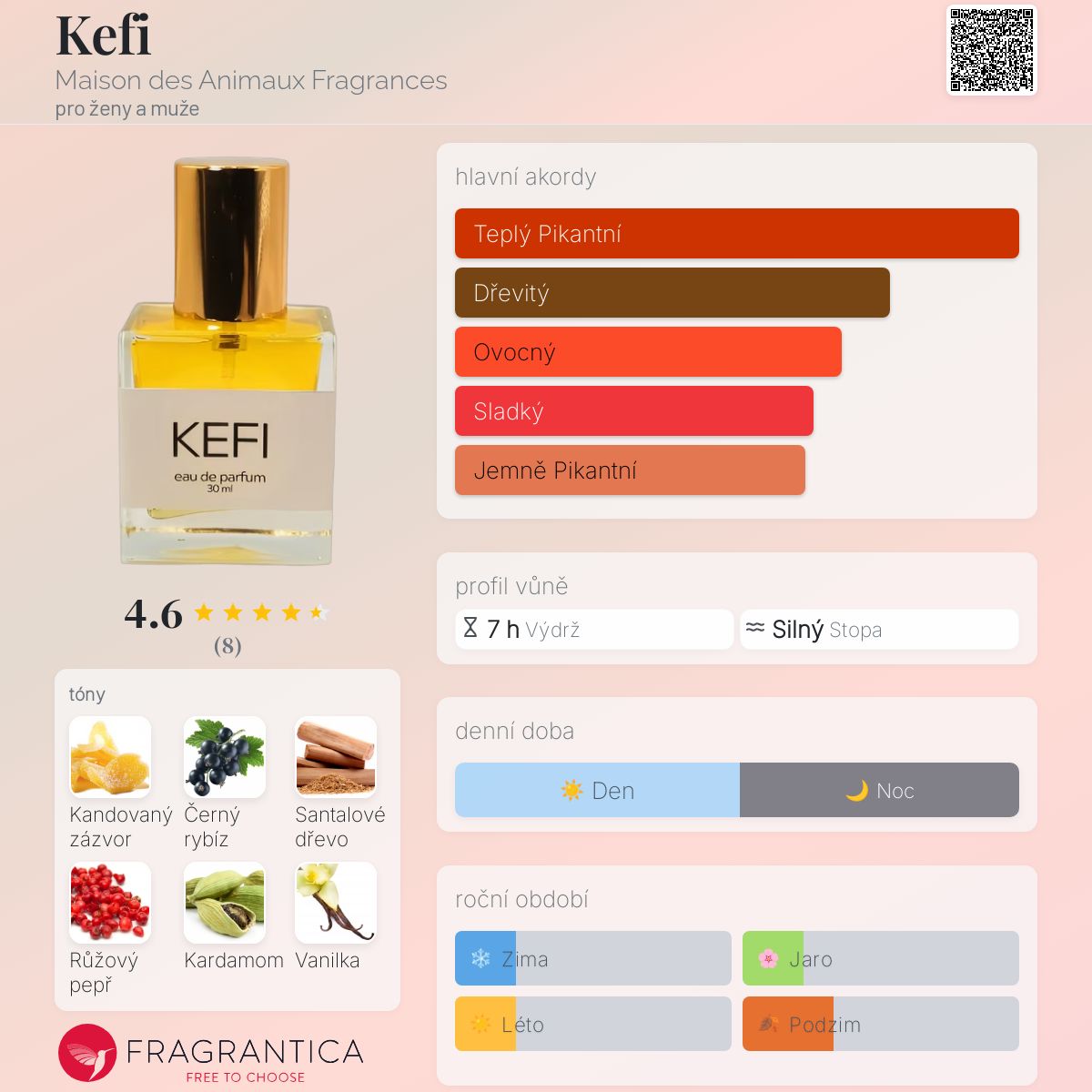 Kefi podle Maison des Animaux Fragrances je vůně pro ženy a muže. Toto je nová vůně. Kefi byl/a uveden/a v roce 2025. Vrchní tóny jsou Černý rybíz, Růžový pepř a Kardamom; základní tóny jsou Kandovaný zázvor, Santalové dřevo a Vanilka.