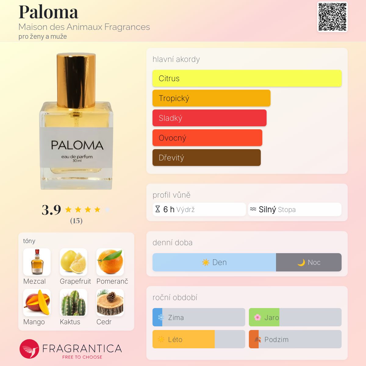 Paloma podle Maison des Animaux Fragrances je vůně pro ženy a muže. Toto je nová vůně. Paloma byl/a uveden/a v roce 2025. Vrchní tóny jsou Růžový grapefruit, Sladký pomeranč, Zelené mango a Kaktus; základní tóny jsou Mezcal a Texaský cedr.